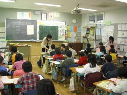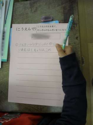 1年2組の算数授業です。金曜日の5時間目ですが、子どもたちはきちんとした態度で学習しています。今日は、絵を見てたし算の問題作りです。考えた問題は友達が解きます。1年生も1年間でずいぶん成長したと感じました。2年生になる準備ができています。
