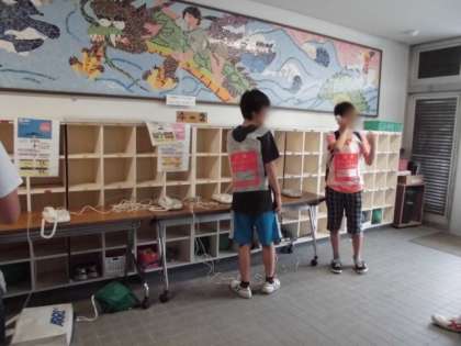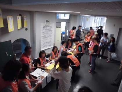 本日は、避難所運営訓練と防災体験が行われました。あいにくの雨のため、起震車や煙体験等の屋外での防災体験はできませんでした。地域の方々やPTAの皆様だけでなく、中学生ボランティアも活躍しました。