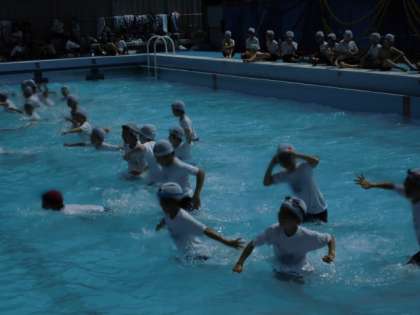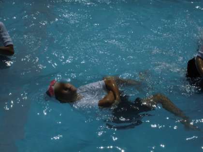 あと4日で夏休みです。夏休みには、プールや川、海など、水辺で遊びを楽しむこともあると思います。そこで、安全指導の一環として、体育着を着た状態での水泳を体験させる「着衣泳」を行いました。体育着を着た状態で、水の中を走ったり、浮いたりしました。2Lのペットボトルを使って、長い時間浮く経験もしました。