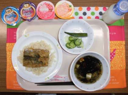 今日は1学期最後の給食です。1学期の間、好き嫌いせずがんばって給食を食べてくれた子どもたちのために、お楽しみのセレクトデザートにしました。子どもたちは、事前に4種類のシャーベットの中から好きなものを1つ選びました。学校給食用ですので、アタリ・ハズレはありませんが、子どもたちは、喜んで食べていました。