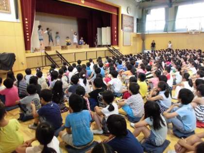 何人が変わったかを、当てるゲームです。子どもたちのたくさんの目が、じっとステージに注がれました。