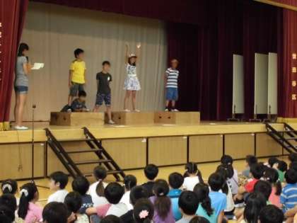 今日は、まちがいさがし集会です。ステージに並んだ5人の出題者が、ポーズをとって立っています。パネルでかくれたと思ったら・・・ポーズや位置が変わっていました。