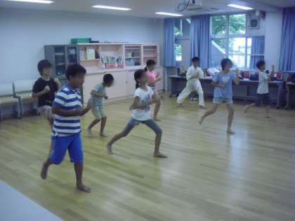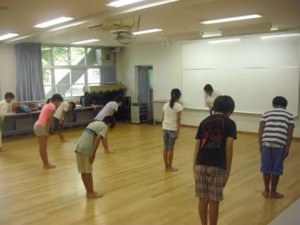 凛々しい表情の高学年は丁寧に手足を動かして、視聴覚室に厳かな雰囲気が醸し出されました。