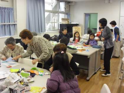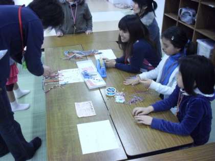 昔遊びは、コマにけん玉、羽子板、折り紙のコーナーもあります。ミサンガ作りも楽しいです。