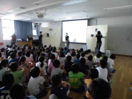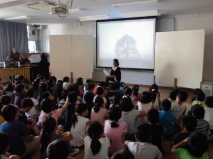 学校運営委員会の読書活動応援委員会(DKO)の皆様による、「おはなし会」がありました。今日は、3.4年生の児童に「だんなも、だんなも、大だんなさま」と「葉っぱのフレディー」という本をお話しくださいました。子どもたちは、ペープサートやスクリーンに写し出される様々な自然の景色に見入りながら、いのちのお話しにも、真剣な表情で耳を傾けていました。