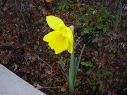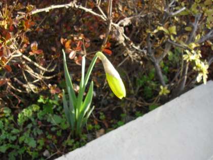 花壇に朝露を浴びた水仙の花が一輪咲いていました。もうひとつは今にも花を咲かせそうです。春がもうそこまで来ているなと冷たい空気の中で感じました。