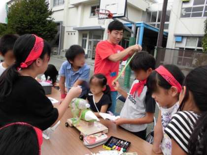 班ごとに協力して作ったペットボトルカーで走行距離を競いました。うまくバランスをとって遠くまで走るように工夫したり、デザインに凝ったりして、各班のオリジナルのペットボトルカーが完成しました。練習も含めてなんと12メートルも走った班もありました。
