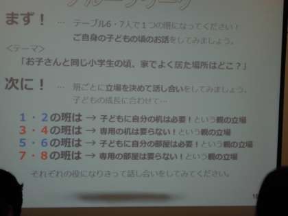 PTA主催の第2回家庭教育学級が開催されました。講師に、一級建築士の村上まみ先生をお招きして、「子供の発達段階とモノの管理」というタイトルで、住いのプロとしての視点と母親としての視点の両方から、子どもの居場所についてお話いただきました。途中、保護者の皆様に、子どもの居場所(環境)について考えていただくグループディスカッションもありました。