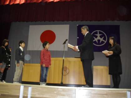 各クラスの代表が校長先生より終了証をもらいました。