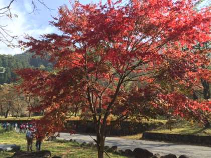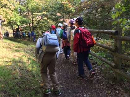 午前中は21世紀の森のハイキングです。気温は低いですが、今日もとても良いお天気です。紅葉の景色を見ながら秋を感じて、各班でのハイキングスタートです。