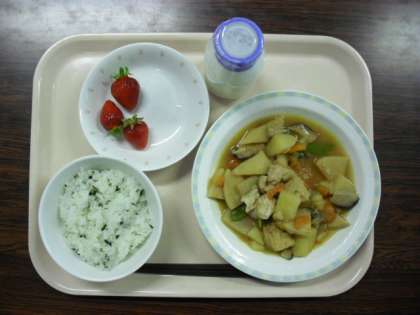 平成22年度の給食が始まりました。献立は、春やさいのうま煮、わかめご飯、イチゴ、牛乳です。平成20年10月からの給食食材高騰による緊急支援が3月で終了したので、栄養士の工夫で質が落ちないように努力していきます。ご理解ください。