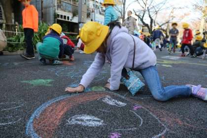 1年生は、学校南側の呑川緑道にチョークで思い思いに絵を描く「吞川ジャック」を行いました。武蔵野美術大学の協力で、活動後の写真を廊下に掲示しました。