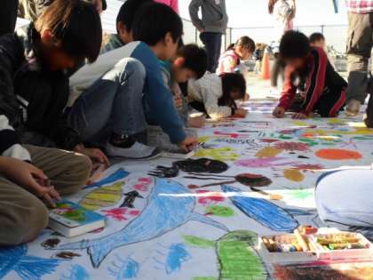 2年生は、屋上で大きな布にクレヨンでたくさん動物を描きました。活動後には、教室前の廊下に貼り出し、「東深沢動物園」をつくりました。
