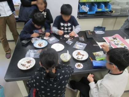 3年生は、理科室で木の実や種を使ってアクセサリーをつくる「種でつくろう」を行いました。