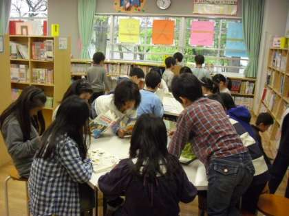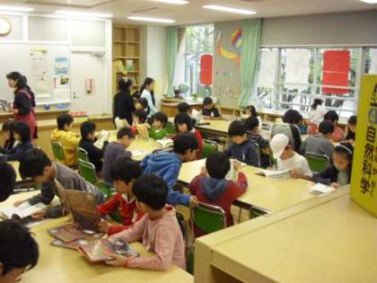 外は冷たい雨で、今日はうち遊びです。こんな日の図書室は大人気です。とても静かに本を読んでいます。本の好きな子供はたくさんいます。