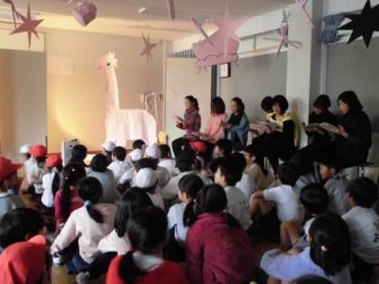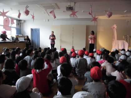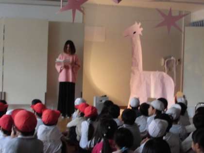 一歩入った視聴覚室の天井からは、様々な桃色の飾りがぶら下がっていたり、お母様方の洋服もきりんのきりこと同じ桃色だったりで、柔らかな桃色の素敵な会場が作られていました。