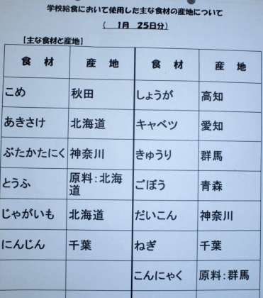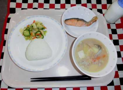 1月24日から1月30日は全国学校給食週間です。そこで、今週の給食は全国学校給食週間にちなんだ献立になっています。日本の学校給食は明治22年(1889年)、山形県鶴岡町(現在の鶴岡市)で始まりました。戦争による中断がありましたが、今日では子どもたちの成長を支え続けると同時に、学校教育の一環として位置づけられています。当時の内容は、おにぎり、塩さけ、菜の漬物だけでしたが、栄養バランスを考慮し、豚汁もつけています。子どもたちは、昔の給食を思い浮かべながらしっかり食べてくれたようです。