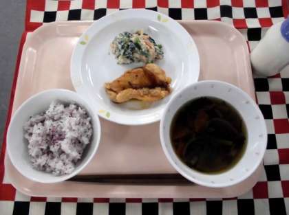 今日の献立は、広島県の郷土料理をとりいれました。広島県は温暖な気候で穏やかな瀬戸内海や、美しい山々に囲まれています。新鮮な海の幸・山の幸に恵まれ、レモンの生産量も全国第1位です。今日の「鶏肉のレモンソースかけ」は油で揚げた鶏肉に酸味がきいたレモンソースをかけました。甘酸っぱい味付けが食欲をそそります。