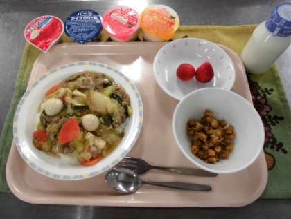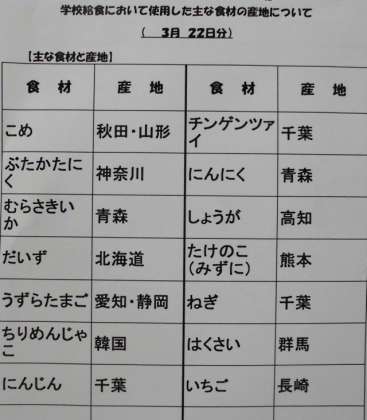 今日の給食は、6年生の卒業と1年生から5年生の進級をお祝いして、お楽しみの『セレクトデザート』にしました。1番人気は雪見大福で、次いでみかんシャーベット、バニラアイス、りんごシャーベットの順でした。また、献立にはありませんが、特別に長崎県産の「ゆめのか」という品種のいちごもつけました。デザートが二つになってしまいましたが、どちらも残すことなくしっかり食べていました。午後の卒業式予行練習では、成長した立派な姿を見ることができ、感慨無量でした。今年度の給食はこれで最後となりますが、平成28年度も東の子ども達が楽しみにしてくれるような、おいしい給食を作っていきたいと思います。