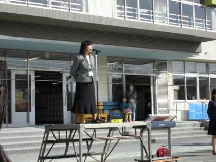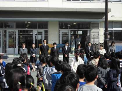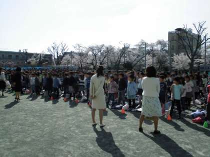 まずは校庭に全校児童が整列して、着任式が行われました。