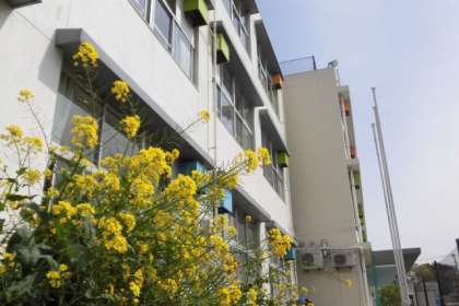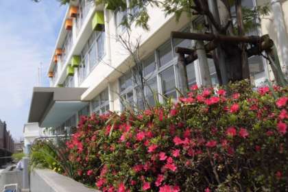 花だんには、児童の入学・進級を祝うように、春の花がきれいに咲いています。