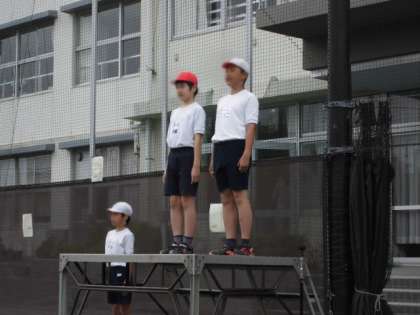 体育朝会の最後には、紅組白組の応援団長から、今年のスローガンが発表されました。