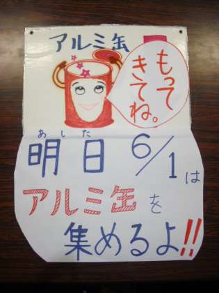 明日(6月1日)はアルミ缶回収日です。缶を洗ってつぶしてお持ちください。よろしくお願いします。(PTAアルミ缶実行委員会)