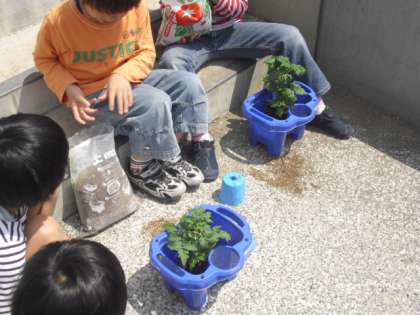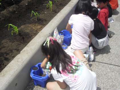 ミニトマトの苗を一人一人の鉢に植えました。これからは毎日観察です。例年ですと夏休みにたくさんの収穫ができます。さて、今年のミニトマトの育ちと収穫はどうでしょう。子どもたちが愛情を注ぎ育てます。自分が育てた野菜はおいしく食べられます。これも命の学習です。