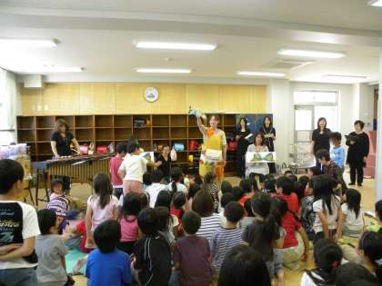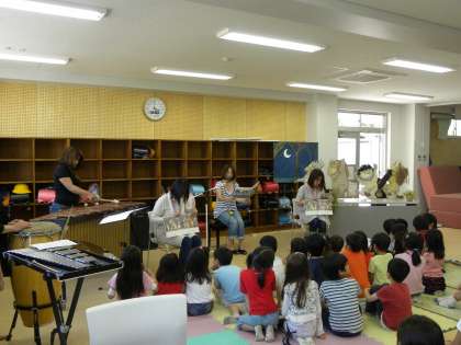いろいろな楽器や歌、エプロンシアターによるおはなし会を子どもたちも食い入るように見つめていました。(DKO 玉井)