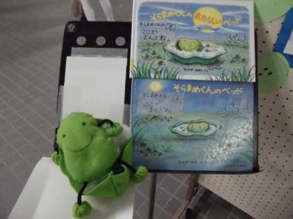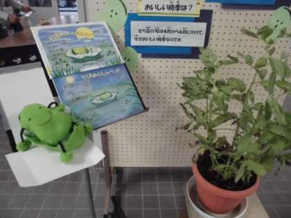 「そらまめくんのベッド」と、「そらまめくんのあたらしいベッド」の絵本も児童には大変好評で、展示を始めてから2週間になりますが、毎日多くの児童がそらまめ君の絵本を鉢植えのソラマメの横で読んでいます。