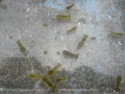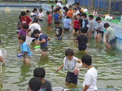 はじめはプールに入るのをためらっていた子どもたちも、少したつとヤゴ採りに夢中です。一人で10何匹ものヤゴを捕まえて子どももいました。