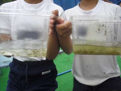 4年生は、プール清掃前の恒例のヤゴ採りをしました。
