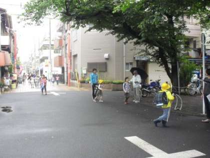校外班の当番のお母様方が街角に立って子どもたちの登校を見守ってくれます。