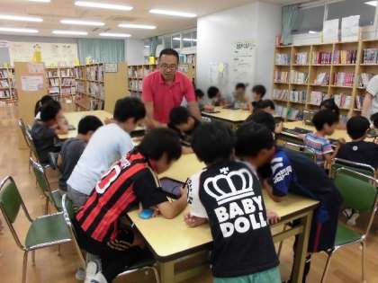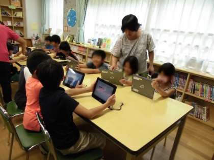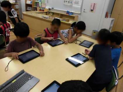 タブレットで、動画を撮ったり、紙芝居をつくったりして、友達と見せ合いました。独特な操作方法にもすぐに慣れて、楽しそうに扱っていました。遊びながら、タブレットに親しみました。