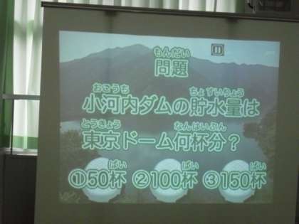 社会科の学習で「くらしを支える水」を学習していますので、子どもたちにとっては復習する良い機会でした。キャラバン隊からの質問に次々に手が挙がります。ビデオ学習では、現地で働く人へのインタビューや水源林の様子も見ることができました。「思ったより広いんだ」「こんなところで働くのは大変だね」等、子どもたちが感想を口にしていました。