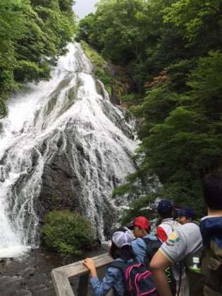湯滝を見学しました。目の前の大きな滝の迫力に皆感嘆の声をあげていました。