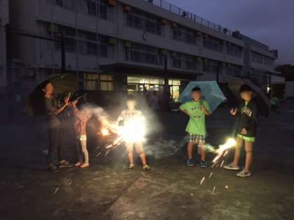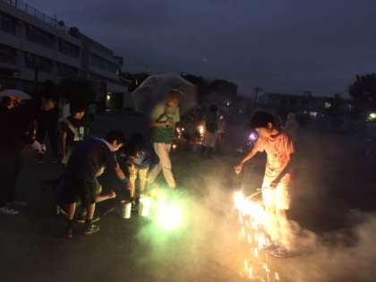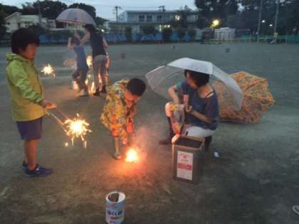 小雨の中でしたが、「遊びの場開放の花火大会」が開催がされました。前半は、皆思い思いに、ご家族や友達と手持ち花火を楽しみました。