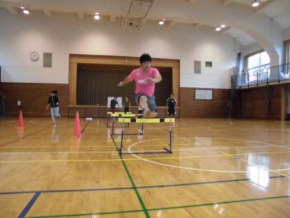 体育は、ハードル走とマット運動の指導方法を、実技を通して研修しました。