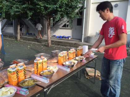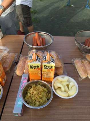 朝食はカンガルーホットドッグです。朝早くからおやじの会の皆さんが、キャベツを刻んで炒めたり、フランクフルトを茹でたりして、材料を準備してくださいました。