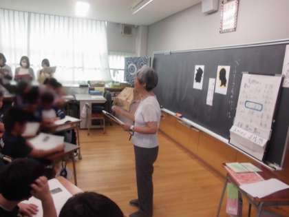 5年1組の桜井秀子主任教諭が、自作の教材「ベールマンさんのけっ作」を使い、主題である【生きる喜び】について登場人物の生き方を通して考えさせました。
