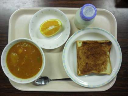 献立は、シナモントースト、トマトシチュー、バレンシアオレンジ、牛乳です。