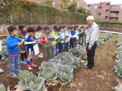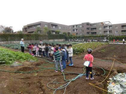 3年生の社会科「農家のしごと」の学習として、JA世田谷目黒の方に来ていただき、世田谷の農業について教えてもらいました。また、近くの畑に行って、大根やキャベツを栽培している様子を、実際に見て学びました。