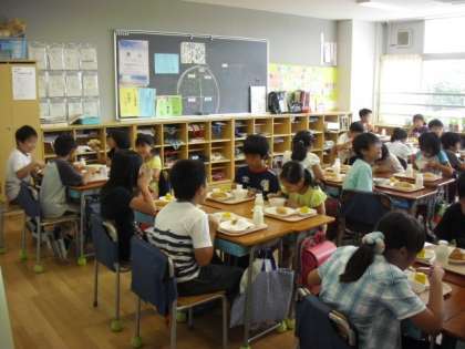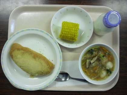 給食の献立は、牛乳・あげパン(きなこ)・肉団子入りはるさめスープ・ゆでトウモロコシです。給食の時間に4年生の教室を訪問しました。みんなおいしそうに給食を食べていました。給食のあげパンは、人気のメニューです。お父さんやお母さんも給食のあげパンには、思い出がありますか。