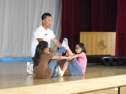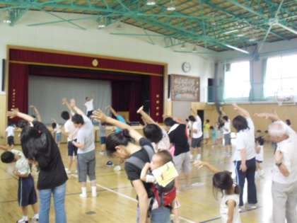 17日(土)に「親子でラジオ体操」の講習会を行いました。PTA学級代表委員会と地域の「正しいラジオ体操普及隊」の方々にお力添えをいただきました。講師に、NHKのテレビやラジオに出演している、多胡 肇 先生をお迎えしました。ラジオ体操の前に、体をほぐす運動も紹介していただきました。体育館は120名の参加者の熱気であふれていました。