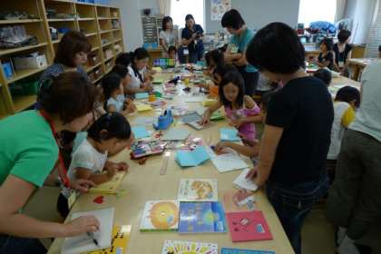 オリジナルの絵本作りです。読書活動応援委員会(DKO)のお母様方がたくさんいらしていただき、子どもたちの絵本作りをサポートです。自分で作ったお話を自分だけの絵本にしました。「校長先生見てみて」とたくさんの子どもたちに声をかけてもらいました。どの作品もとっても素敵です。この夏の思い出に大切な宝物が一つできました。