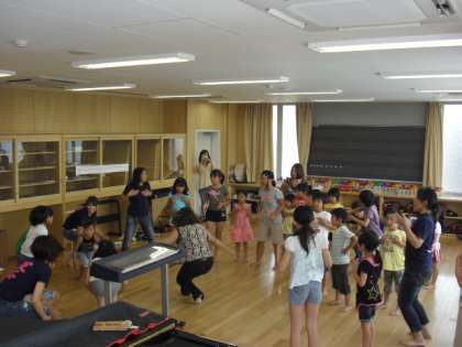 保護者と和太鼓サークル鼓桜のメンバーの協力を得てのボディーパーカッション。体中を打楽器にして楽しみました。最後は、全員で「ひがしのなかま」の演奏です。