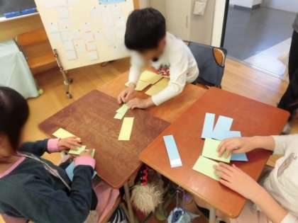 箱の形を構成する6つの面を分類し、つながりや組み合わせを考え、箱が組み立てられる面の並べ方を調べて発表しました。