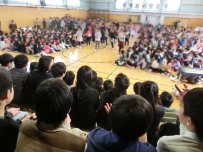 体育館で、6年生を送る会がありました。集会委員会によるクイズ、1〜5年生からの出し物、6年生からの演奏など、楽しみながら時間を過ごしました。また、記念品として、メッセージ入りのしおりが贈られました。その後、1〜5年生の各学級に6年生が来て、一緒に給食を食べました。