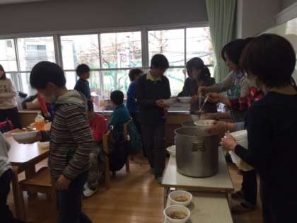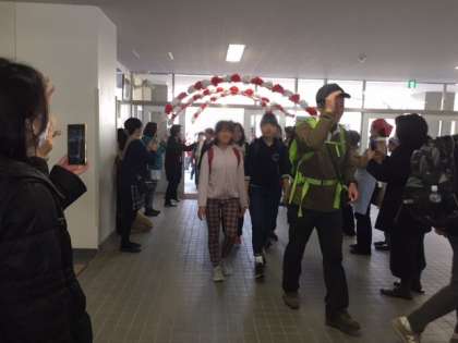 学校から羽田空港まで往復35キロの道のりを、おやじの会の皆様に見守られながら、皆しっかりと歩き通し元気に学校へ戻ってきました。学校では美味しい豚汁やおにぎりを作ってお母様方が出迎えてくださいました。