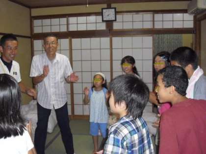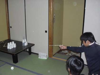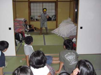 夜のお楽しみは室内レクです。それぞれの部屋で出し物をします。ゲームあり、クイズあり、劇ありと、とても盛り上がっていました。